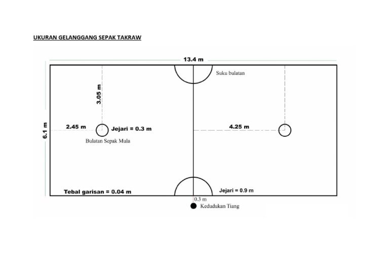 Gelanggang pasir atau rumput tidak dibenarkan 2 Lebar semua garisan gelanggang tidak melebihi 004 m di ukur ke dalam dari penjuru ukuran gelanggang. Tinggi bersih 145 meter ke samping dan setidaknya 142 meter di tengah lapangan. Baca versi flipbook dari sukan sepak takraw sekolah rendah.
